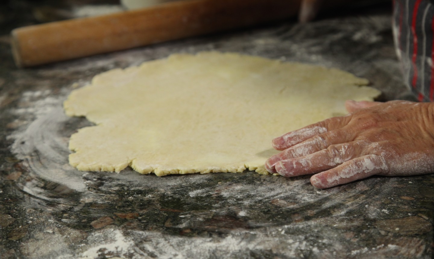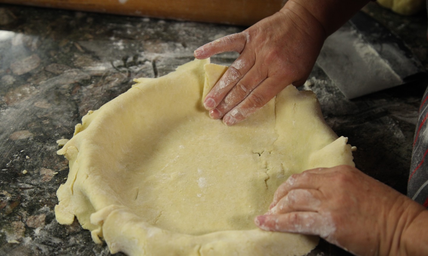 Siga extendiendo la masa hasta que la circunferencia de la masa sea aproximadamente 4" más ancha que su plato para tartas. (Coloque el plato para tartas boca abajo sobre la masa para ayudarle a medirla). Intente que la corteza sea lo más redonda posible, pero no se estrese por conseguirla perfecta.
